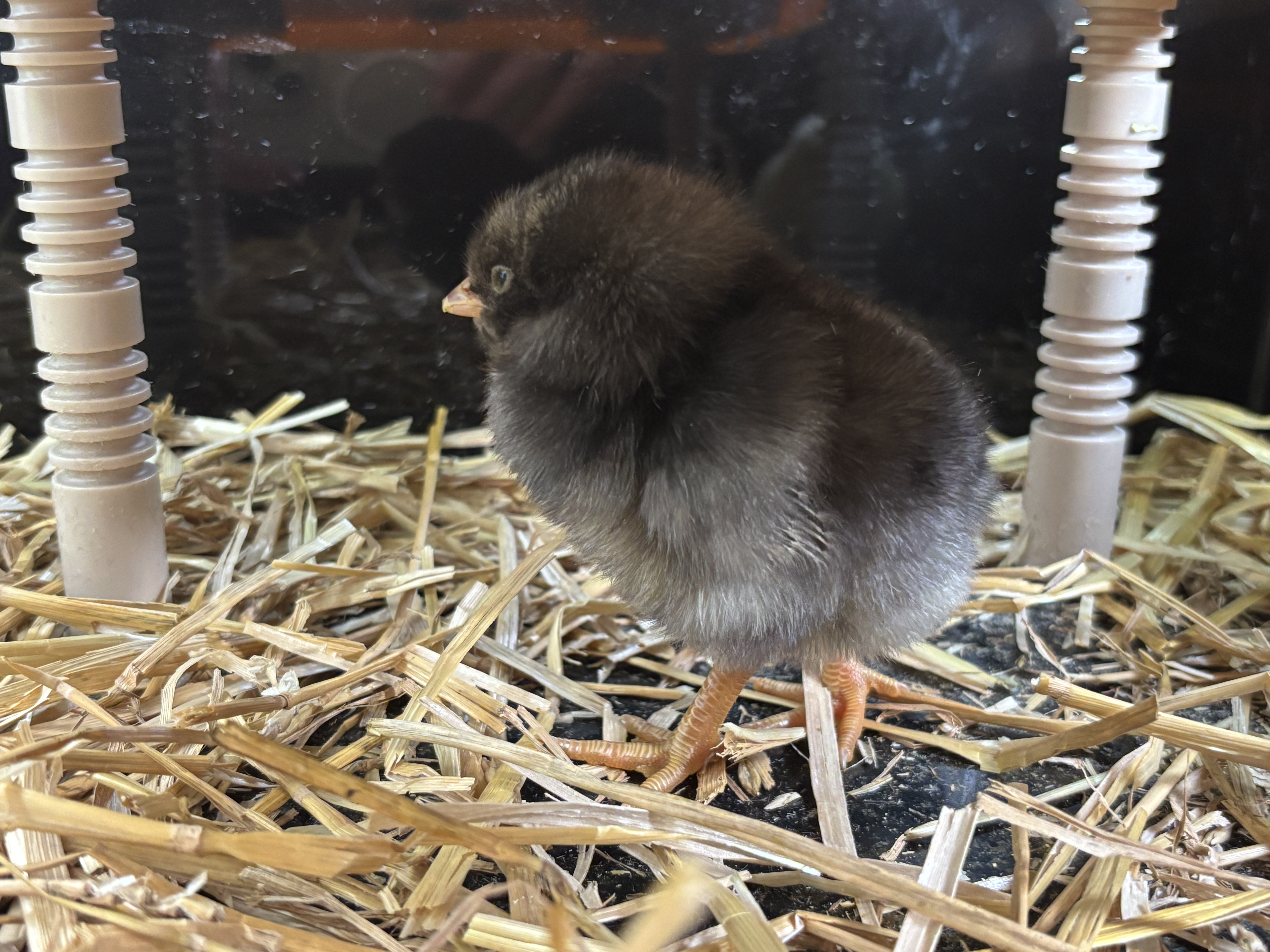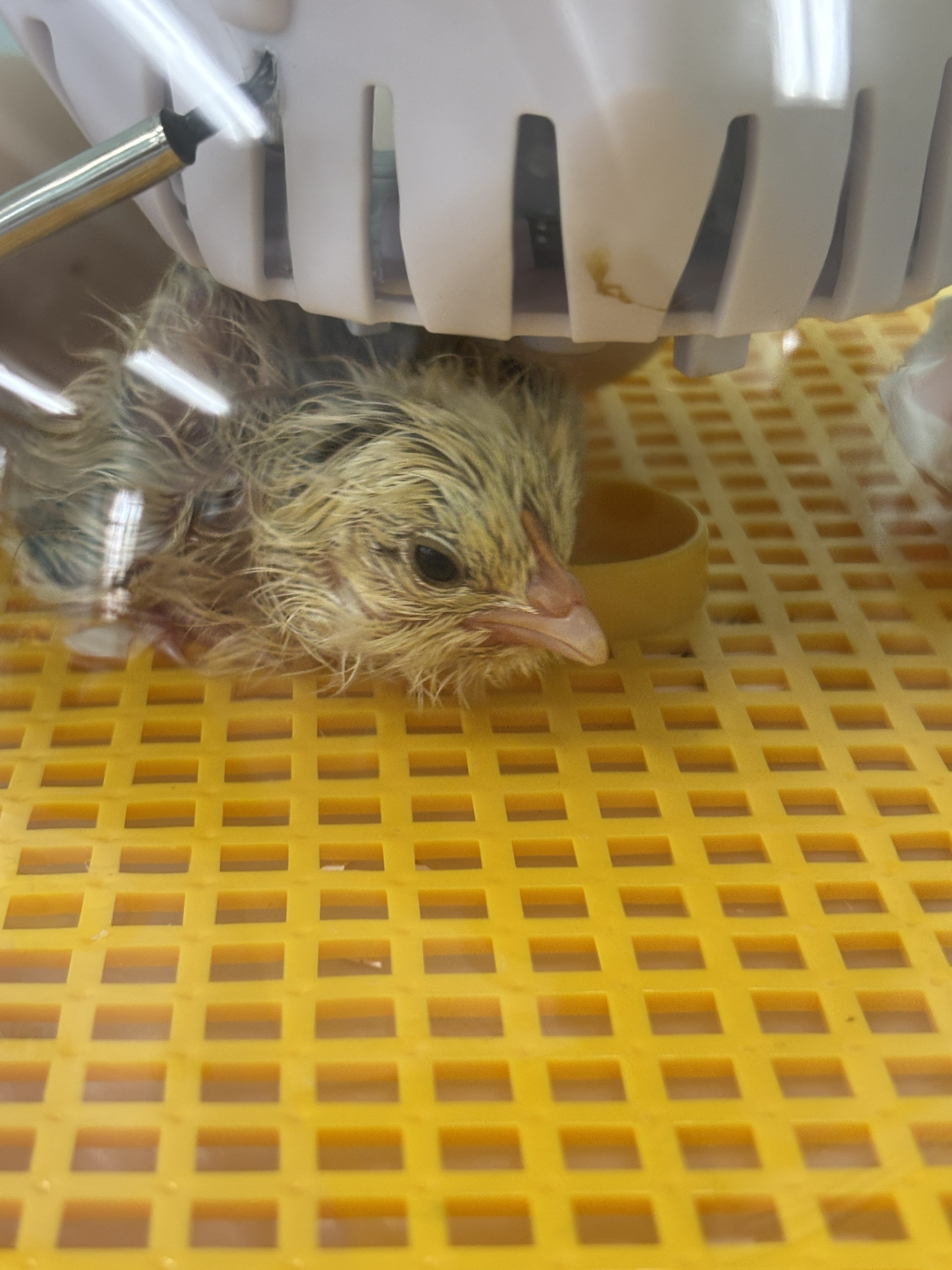 Then, on Day 21, right on schedule, the chicks began to hatch. The first to hatch was Jumper. Jumper has a bit of grey in its yellow fluff and is full of life. because they were the first to hatch, Jumper is a bit more comfortable with people because they were bonding with us while the others were still making their way out of their shells.