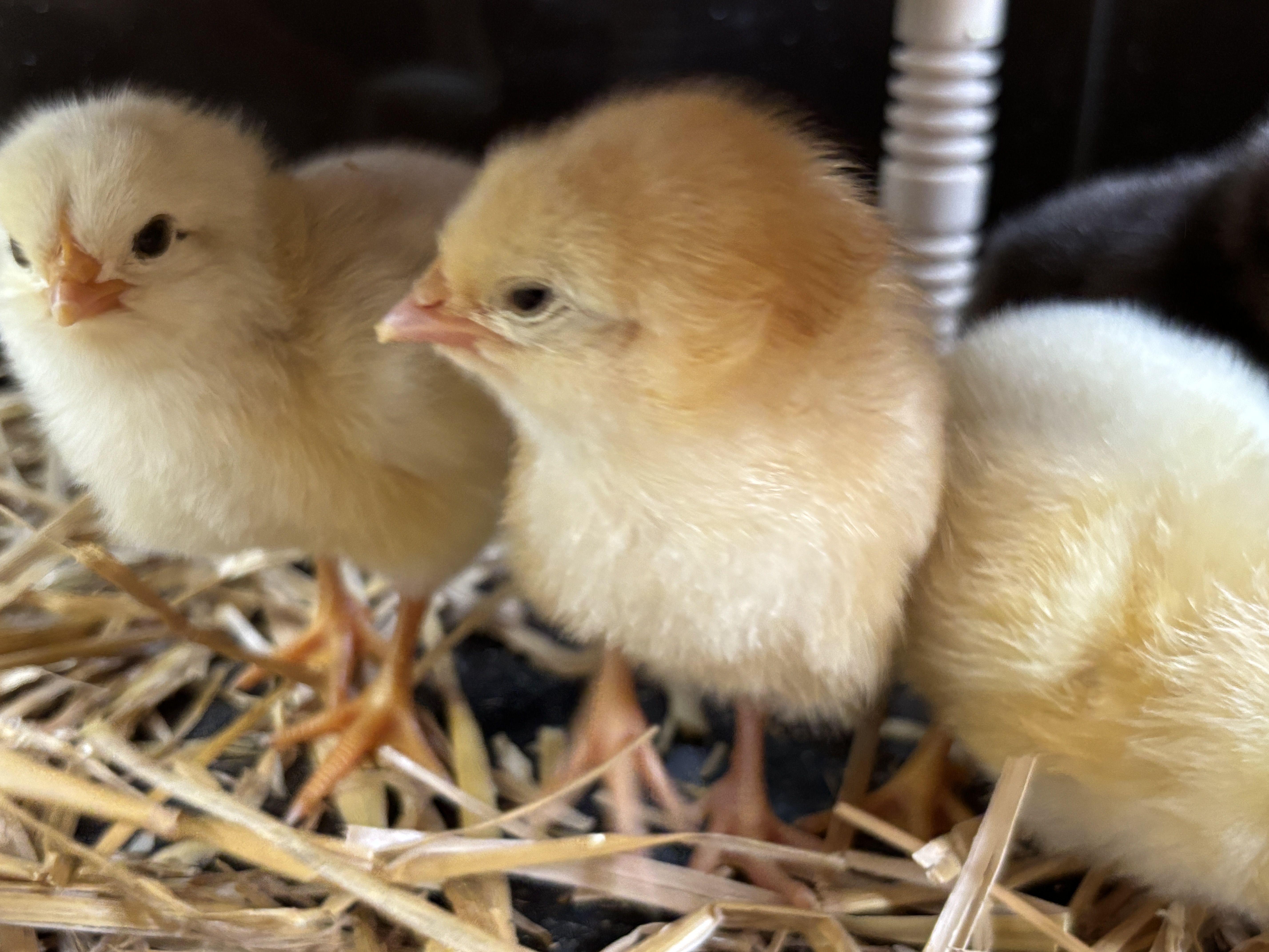 By morning, we had 3 more chicks! They all fluffed up through the day and then we could move them to the brooder. The light yellow one is named Sonny, the darker yellow one is Goldy, and the black one is Midnight. The chicks love to spend time under the heat lamp. They are getting acustomed to all the friends who come to visit.