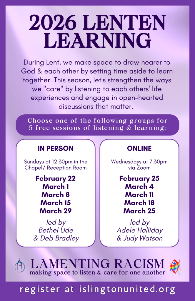 During Lent, we make space to draw nearer to God & each other by setting time aside to learn together. This season, let’s strengthen the ways we “care” by listening to each others’ life experiences and engage in open-hearted discussions that matter.