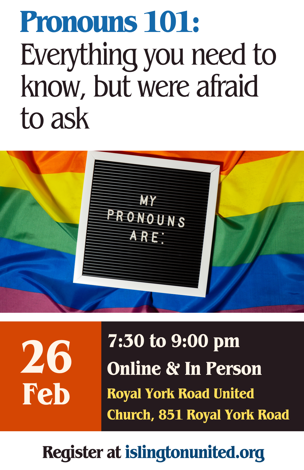 We will share information about pronouns, gender identity and ways to be a good ally. Please bring all your questions to share in a safe space.