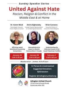 Please join us online or in person for the Anti-Racism Speaker Series United Against Hate: Racism, Religion & Conflict in the Middle East and at Home.Â