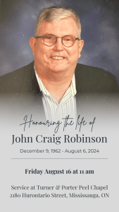 The tribute to John’s life will be 11 am on Friday, August 16 at the Turner and Porter Funeral Home (Peel Chapel), 2180 Hurontario Street, Mississauga, with a reception to follow. Online condolences may be sent by visiting MEMORIALS – Turner & Porter Funeral Homes Ltd. (turnerporter.ca)