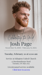 Born on November 15, 2000 to Lisa MacIntosh and Todd Page, Josh was an avid fan of music, basketball, anime, among many other things. Far more than his various interests, Josh had a heart for people. He cherished the people around him and the time he spent with them. He was a singular soul who had a magnetism entirely his own – people were drawn to Josh and he offered them a lot. He will be deeply missed.