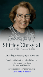 Shirley’s visitation and funeral will be held on February 15, 2024 at Islington United Church (25 Burnhamthorpe Rd, Toronto, ON). Visitation will take place from 10 to 11 am. A Funeral Service will start at 11 am with a reception to follow in the church hall. Interment to follow at St. John’s Dixie Cemetery & Crematorium (737 Dundas St. E, Mississauga, ON).