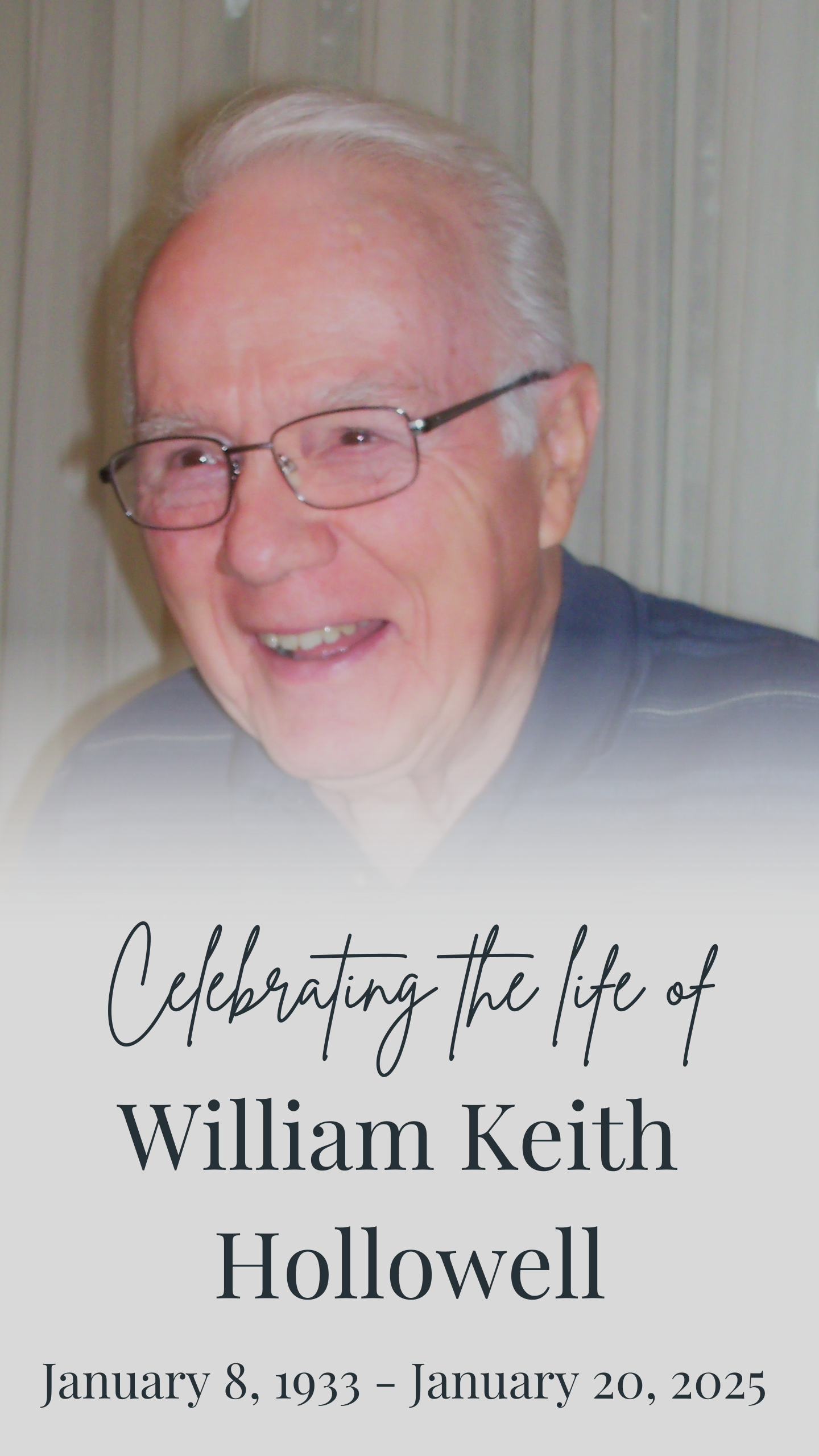 The family of William Keith Hollowell of Etobicoke announces with sadness his passing at his home on Monday, January 20, 2025, from abdominal cancer, after recently celebrating his 92nd birthday. Son of William and Eunice (née Luckey), brother to Joyce Williams (Bob) deceased, and Gordon (Donna Twible). Beloved husband of Joan (née Arnott) for more than 68 years. His kind, generous, helpful nature has been very evident in his children, Patti Litherland (Peter, deceased), Bruce Hollowell, and Pamela Manson (Peter). The same traits are seen in his grandchildren – in Thomas (Amy), Alice, Daniel (Caroline); in Owen, Liam (Miranda); in Emily (Todd), Ross (Sam); and in great-grandchildren William and Emma. All of them were a great pleasure to him.