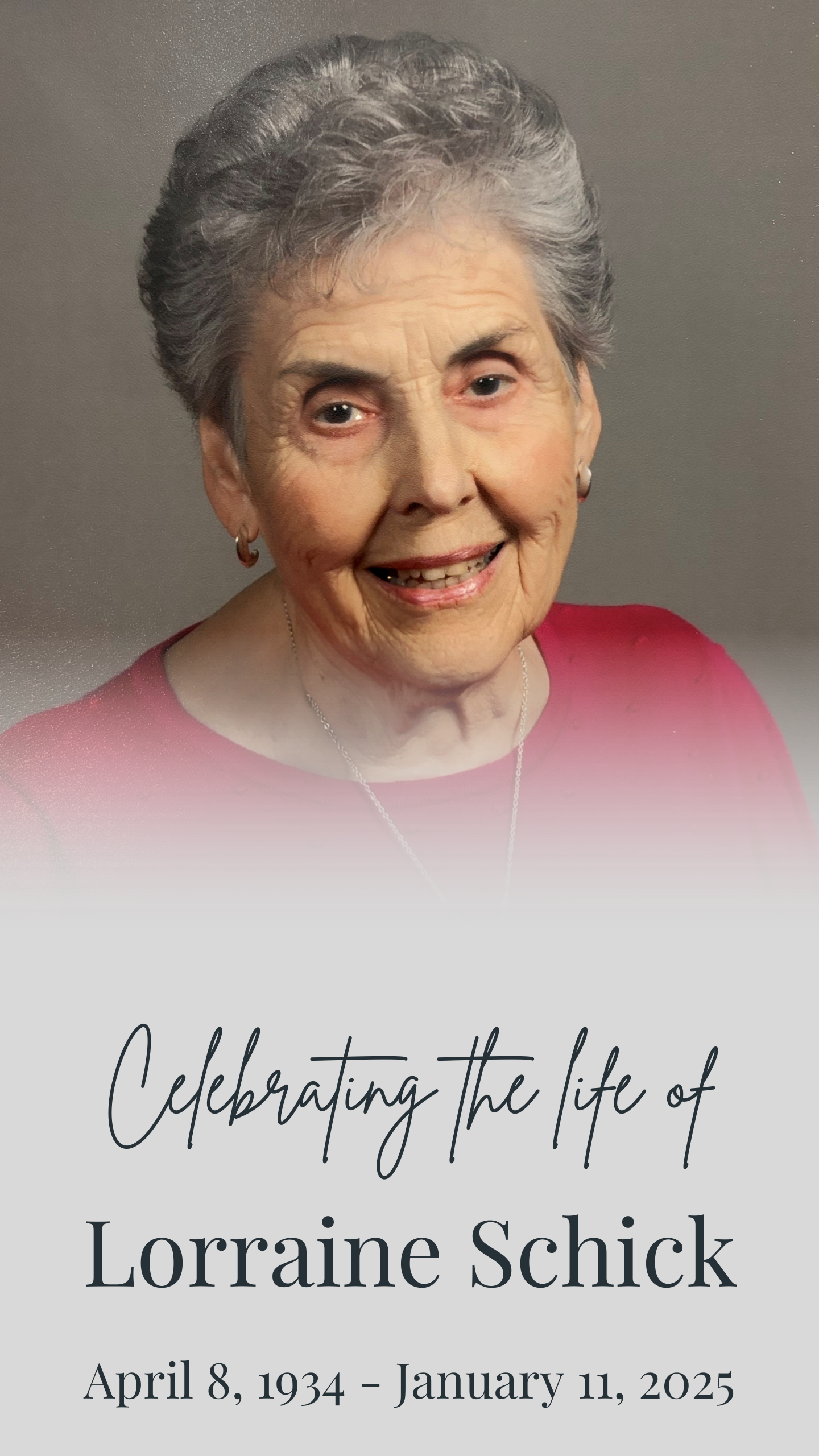 SCHICK, LORRAINE (nee ELMHIRST) It is with deep regret that the family announces the passing of Lorraine Schick on January 11, 2025, at Sunrise of Mississauga, Ontario. Lorraine was born on April 8, 1934, in St. Boniface, Manitoba, daughter of Wilhelmina Mae and Roland (Rollie) Richard Elmhirst. Predeceased by her husband, David Alexander Schick in 2009. She is lovingly remembered by her son, David William and Retta (Jex); daughter, Catherine Anne Schueler; grandchildren, Ryan David and Catherine Schick, Emily Rose Schick, Stephanie Mae and Carson James Schueler; great-grandchildren, Olivia Michelle, Natalie Elizabeth and Jason David with another one arriving soon for which she was very excited about welcoming to the family. Also lovingly remembered by her brother, Brian Elmhirst of Victoria; and her sister-in-laws, Bernice Taylor of Winnipeg, Nora Tyldsley of Montreal and Barbara Elmhirst of Montreal. She also leaves many nieces, nephews, sorority sisters, dear friends and neighbours. Lorraine lived in Winnipeg Manitoba in her early years and graduated from St. Boniface Hospital School of Nursing in 1956. She married the love of her life, David Alexander on May 31, 1958. David William was born in Kenmore, New York and Catherine in Mississauga (formerly Cooksville). Lorraine worked as a Registered Nurse, a Community Animator for local Cable TV, a Welcome Wagon Hostess, Occupational Health Nurse and volunteer for many other community activities. David and Lorraine lived in Mississauga since 1967 and spent many happy years at their cottage in Haliburton. Lorraine loved to golf with Dave, spend time in her garden, travelling and cheering on her Toronto Blue Jays. Her passion for genealogy helped her to research and document both hers and Dave’s family tree. Her family proudly keeps the books she created of this family history. She was the magnet for immediate and extended family, affectionately known as Mom, Grandma, “GG” and “Aunt Lorry” to so many. Memberships included Islington United Church and Beta Sigma Phi Sorority. The family thanks Sunrise of Mississauga for their exceptional care. A celebration of her life will be held at a later date. Cremation has taken place. In lieu of flowers, donations can be made in her memory to the Heart & Stroke Foundation.