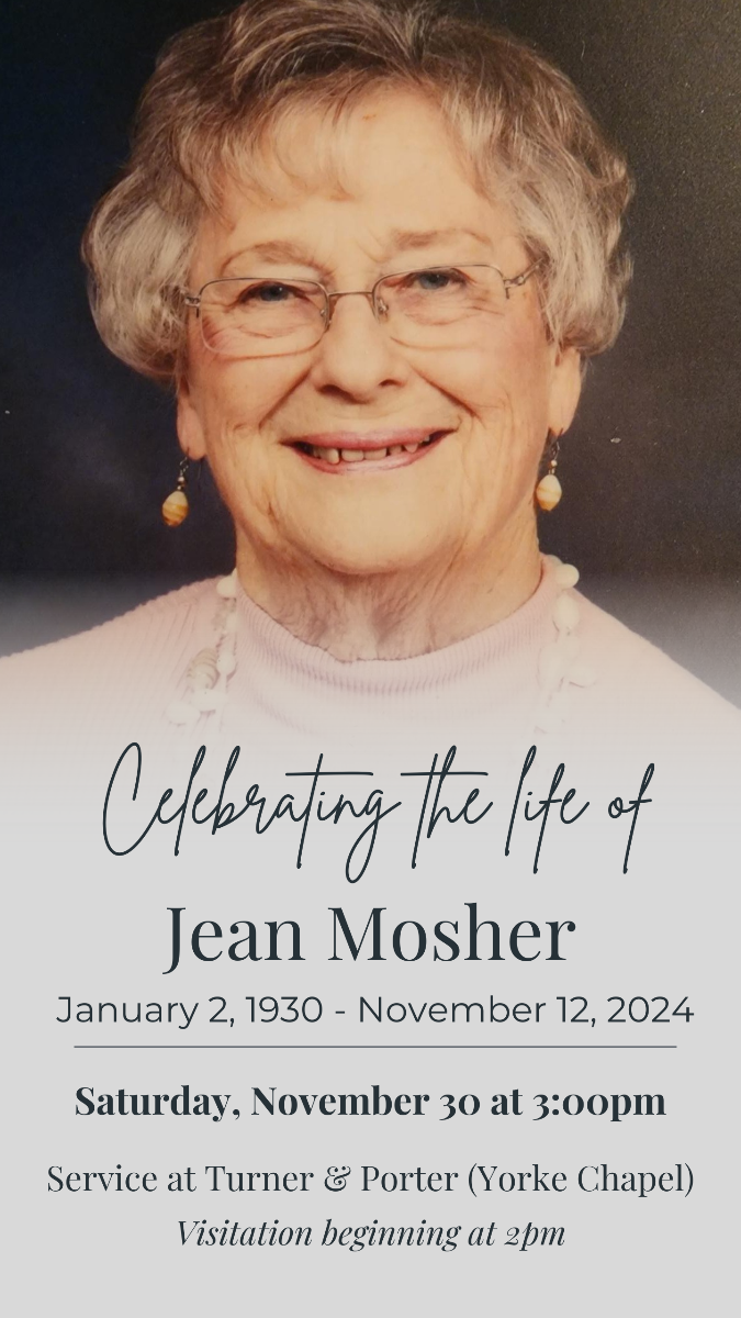 Passed away peacefully at Kipling Acres Long-Term Care Home in her 95th year. Loving wife of the late Arthur Mosher (d. March 30, 2024), and loving mother of Steven (Gerry Wiggett), Teri (Rick Lennon), Glenn, and Kimberley (Robert Freestone), grandmother of Valerie, Heather (Jeff Bias), James and Michael (Nora Weatherston). Great-grandmother of Jude, Jay, and Ava. Born in Etobicoke Township and raised there and in York Township, she worked at Bell Telephone, York Board of Education, Sunbeam Electric, and Allied Chemical. She married Arthur Mosher in September 1953 at Humbercrest United Church and raised their family in Etobicoke Township, in Pakistan (1964-1967), and in the Borough of Etobicoke. In 1968, Mom and Dad bought a home in Etobicoke (Markland Wood), where they lived until 2015. Mom worked hard as a homemaker and showed a great deal of love to her husband and children. She was also involved in charitable work, including as head of the local United Church Explorers at Bloordale United Church, driving elderly patients to hospital appointments, and making deliveries for Meals on Wheels. After they sold their home in 2015, Mom and Dad lived at Scarlett Heights Retirement Residence and later at Kipling Acres Long-Term Care Home. The Mosher family wishes to thank the staff of Kipling Acres for their care and kindness to Mom for the past 16 months. Visitation will take place at Turner and Porter (Yorke Chapel), 2357 Bloor St. West (at Windermere Ave.), on Sat., November 30, 2024, at 2:00 pm, with a Memorial Service to begin at 3:00 pm on that day. Refreshments will follow. In lieu of flowers, donations to the Heart and Stroke Foundation would be appreciated.