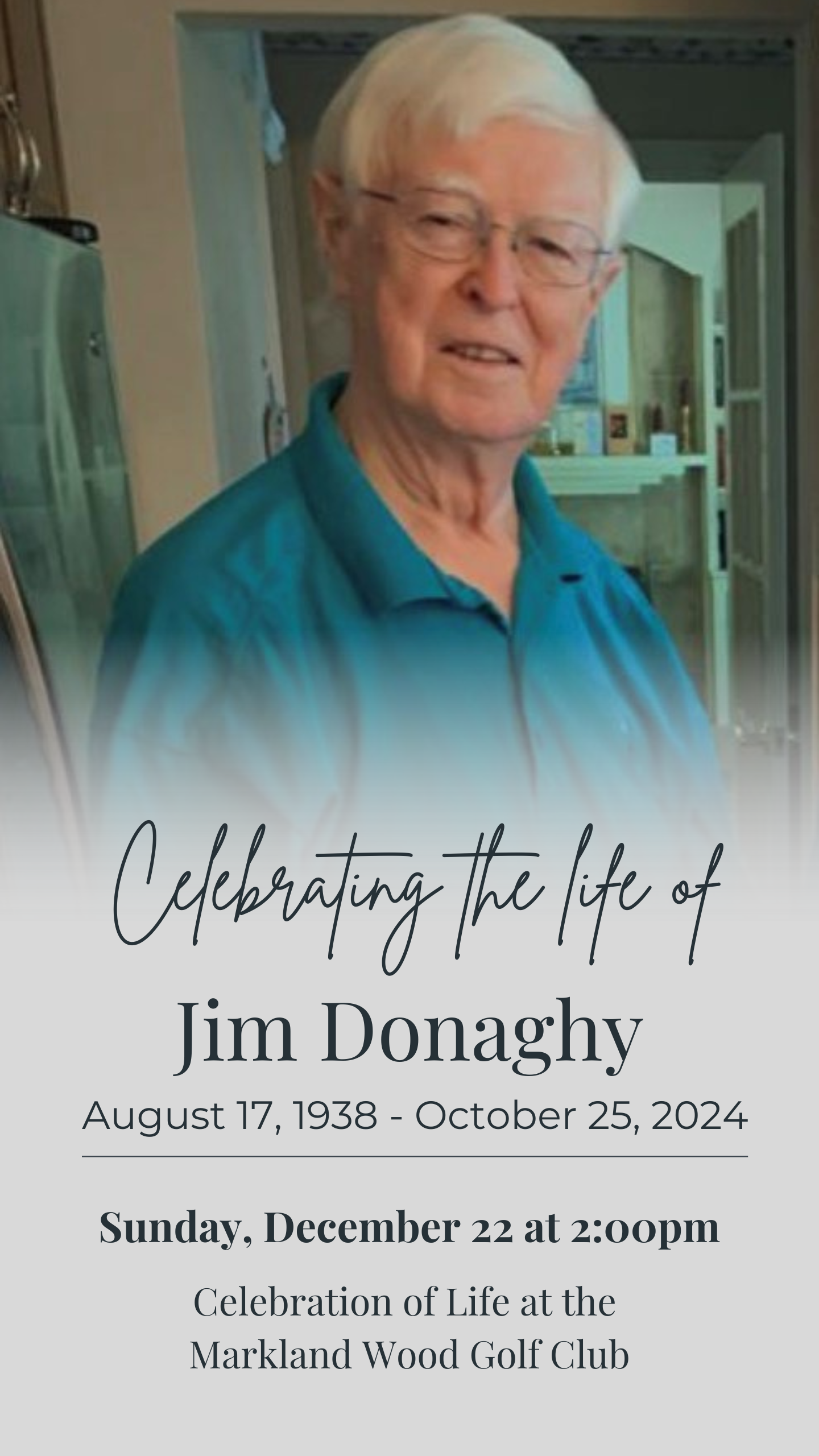 James Brian Donaghy, 86 of Etobicoke died on October 25, 2024 at the Mississauga Hospital. He was born on August 17, 1938, to William and Evelyn (nee Brazier) Donaghy in Ninga Manitoba. Jim attended Brandon College studying geology and chemistry in the late 1950’s and the University of Western where he graduated with a Master of Business Administration. He married Gillian Angus on July 31, 1965 in the United Kingdom where he recalled only knowing Jill and his brother-in-law, John, as his family could not attend. In the following years they had three children, Patrick, Mark and Heather. He worked at Canadian Industries Limited up until he participated in the establishment of AT Plastics as part of the senior management team and retired in 2000. Jim’s passions in life were Jill, his family and the community at large in that order. He was always saying the best decision he ever made was falling in love with Jill and marrying her. Always there to provide guidance and support for family members, he is greatly missed. His favourite extracurricular activity was the time he spent serving on the Board of the Toronto Children’s Aid Society followed by coaching his children’s teams when they were very young in Montreal in the 1970’s. Jim is survived by his wife, Jill and his children, Patrick, Mark and Heather; their spouses, Deidre and Jason and grandchildren, Peri, Mica, Cody, Robert, Katelyn and Dylan. He was preceded in death by his parents, William and Evelyn and siblings, David Donaghy and Willa Harris. Jim’s Celebration of Life will be held on Sunday, December 22nd at 2:00 p.m. at the Markland Wood Golf Club. His ashes will be spread at a later date. Memorials/donations may be made to Sleeping Children Around the World https://www.scaw.org/donations-home