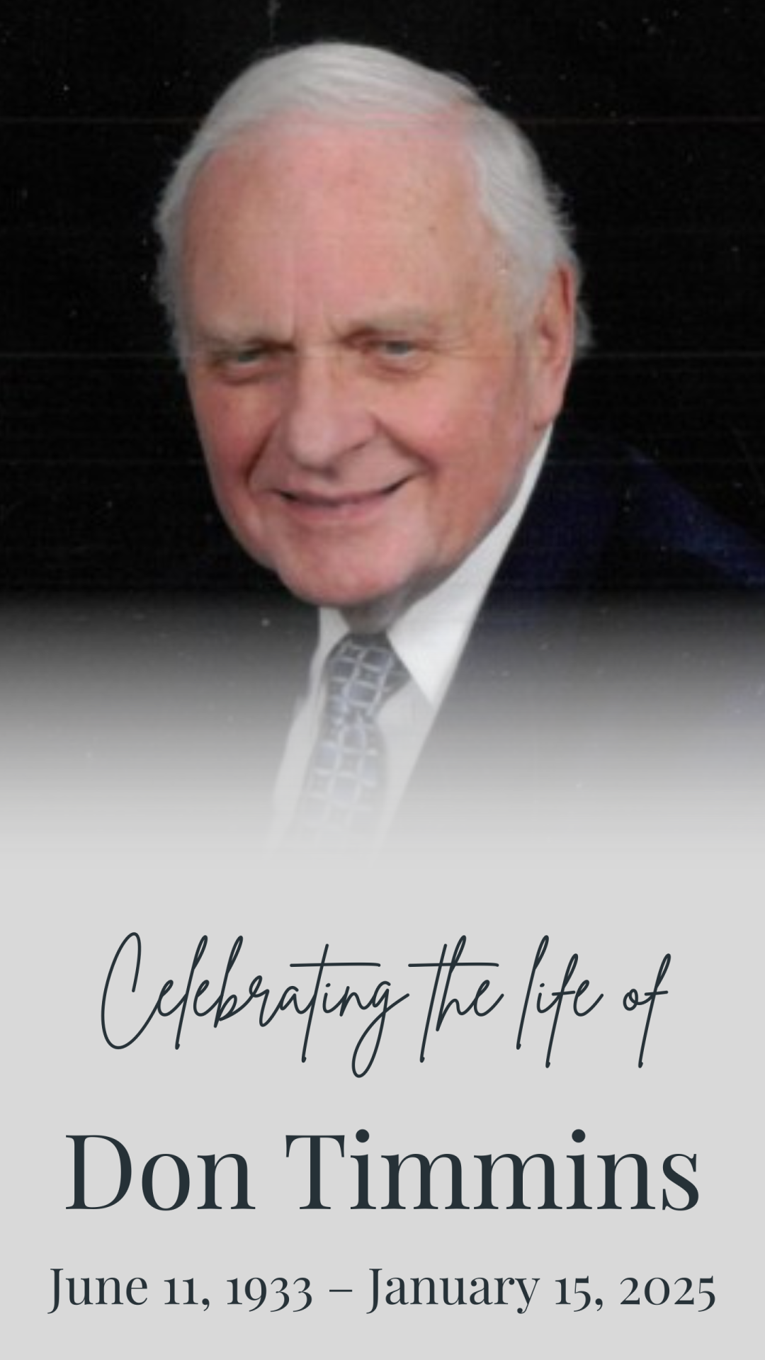 TIMMINS, DONALD GARDINER BA, MEd, RSBA June 11, 1933 – January 15, 2025 Don Timmins passed away peacefully on Wednesday, January 15th in his 92nd year. Don was born in Kingston, Ontario, the son of Preston Irwin Timmins and Helen Coverdale Timmins (nee Gardiner). He was predeceased by his sister, Mary Cassell; brother-in-law, Bill Cassell and his first wife, Myrna Timmins. Beloved husband of Jo-Anne, loving father of Jim, Paul (Daniele) and Kathleen. Proud grandfather of Rachel (Eddie), Vanessa (Sasha), Charity, David (Nicole) and Kadessa; and great-grandfather of Finn, Reece and Chloe. Don’s lifelong love for music began at an early age with piano lessons at age four and singing as a choir boy in the Cathedral choir in Kingston. Don was a longtime member of the Royal Canadian College of Organists. He was organist and choir director at St. John United Church in Hamilton, St. Paul’s United Church in Perth, Forest Grove United Church in Willowdale and Islington United Church in Etobicoke. In his youth Don served as a Guardsman at the Old Fort Henry in Kingston. Don pursued a career as a School Business Official in Hamilton, Napanee, Lanark County and Toronto District School Boards. Following his retirement from the Toronto Board, Don continued to work for several benefit consulting firms for another 25 years, finally retiring at the age of 85. Don enjoyed spending time at his cottage on Mosque Lake and winter months on Hilton Head Island, SC, attending theatre and musical events and reading. Visitation at the Turner & Porter Funeral Home, Butler Chapel, 4933 Dundas St. W., Etobicoke Monday, January 20th from 7:00 – 9:00 p.m. The funeral will be on Tuesday, January 21st at 11:00 a.m. at Islington United Church, 25 Burnhamthorpe Road, Etobicoke and is also available via livestream by clicking here or on the button below. Interment at Park Lawn Cemetery, 2845 Bloor St. W, Etobicoke. Refreshments will be served following the funeral service in the Stewart East Hall, Islington United Church. In lieu of flowers, donations may be sent to Parkinson Canada, (e-mail: donate@parkinson.ca) Online condolences can be made at www.turnerporter.ca.