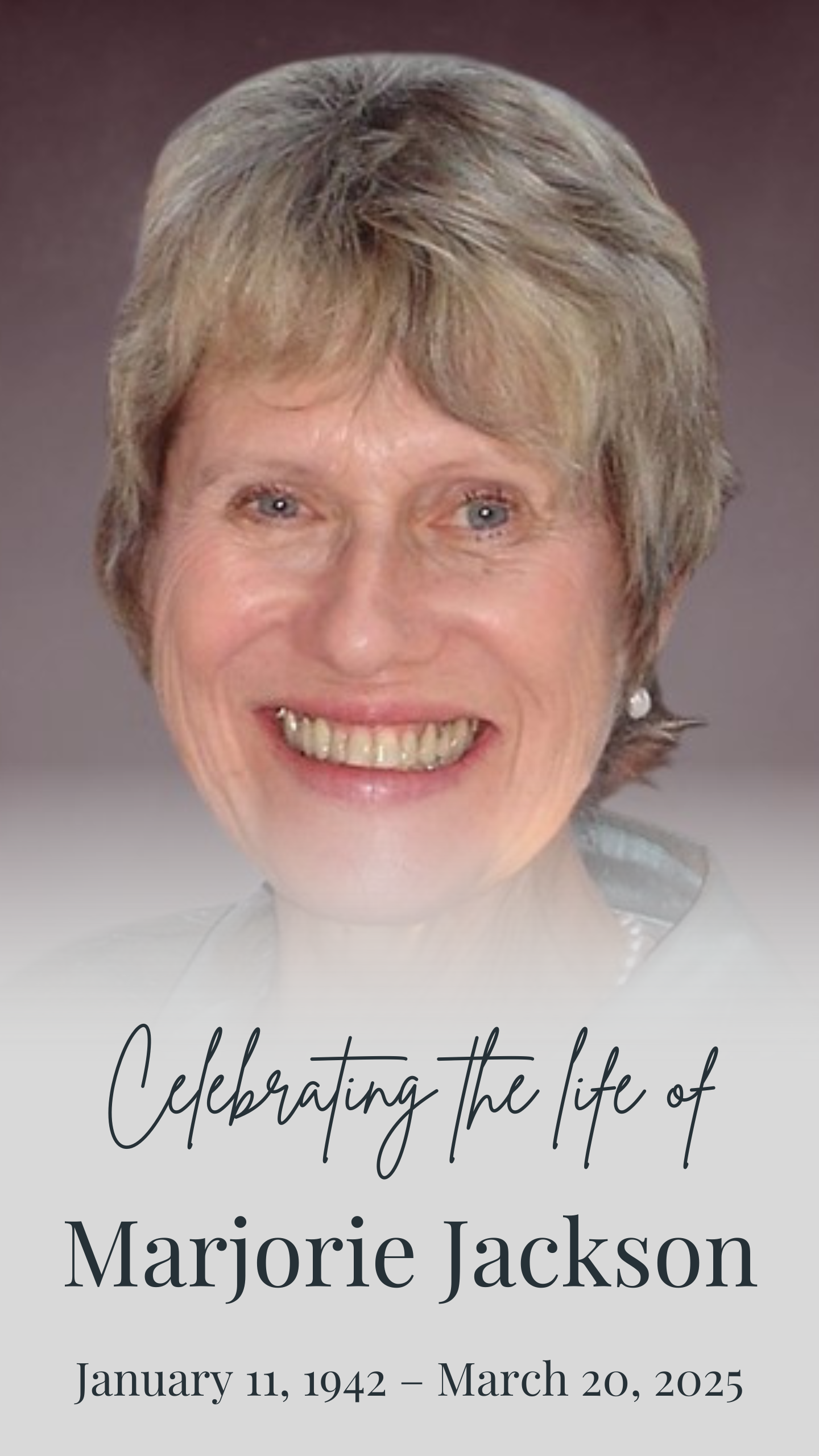 JACKSON, MARJORIE (nee DRAPER) January 11, 1942 – March 20, 2025 Marjorie passed away peacefully, with her family by her side, on March 20, 2025, at the age of 83, after a courageous ten-year battle with Alzheimer’s. Beloved wife of Bruce Jackson for over 62 years. Proud mother of her daughter, Leah, and son-in-law, Mario Ledo; and her son, David, and daughter-in-law, Carrie Jackson. Loving grandmother to Madeline and Jacob Jackson. Dear sister of, and predeceased by brothers, Bill Draper (Patricia) and Ted Draper; sister, Rosemary Draper; and twin sister, Gwen Harvey. Survived by brother-in-law, Carl Harvey; and sisters-in-law, Linda Jackson and Helen Sanderson. Adored aunt to her nine nieces and nephews and their families. Marjorie was one of the most kind and caring individuals, who welcomed everyone into her life and her home with a smile. Marjorie loved hosting and connecting family and friends and many life memories were created under her watch. She would go out of her way to listen to and help everyone she met. Her compassion and generosity touched countless lives, and her legacy of love and kindness lives on through those who knew her. Marjorie started her teaching career in 1961. She taught for many years before having children and she then continued occasional teaching for decades. Marjorie continued her education at Simon Fraser University and volunteered for many years at the Lakeshore Psychiatric Hospital, Bloordale United Church, The Food Bank, Welcome Baby and several other organizations. Marjorie was an avid bridge and tennis player, and loved travelling and spending time at Paudash Lake with family and friends. She continued to help and touch almost everyone she met, even at her care home, Westbury Chartwell, for the past eight years. Sadly, Marjorie had early onset Alzheimer’s and battled through this for the past ten-plus years. Marjorie was joined by her beloved Bruce in the care home in 2020, after he visited her every day for the first four years. Marjorie will be deeply missed, forever cherished and fondly remembered by her extended family and friends. We thank you for the many, many condolences and sentiments, recounting the ways that Marjorie touched your lives and made a difference. Our family would like to extend our heartfelt thanks to the many PSWs and staff for their exceptional care and kindness over the years. In memory of Marjorie, donations may be made to the Alzheimer Society. We will celebrate Marjorie’s life on Sunday, September 7, 2025. Online condolences may be made through: www.turnerporter.ca