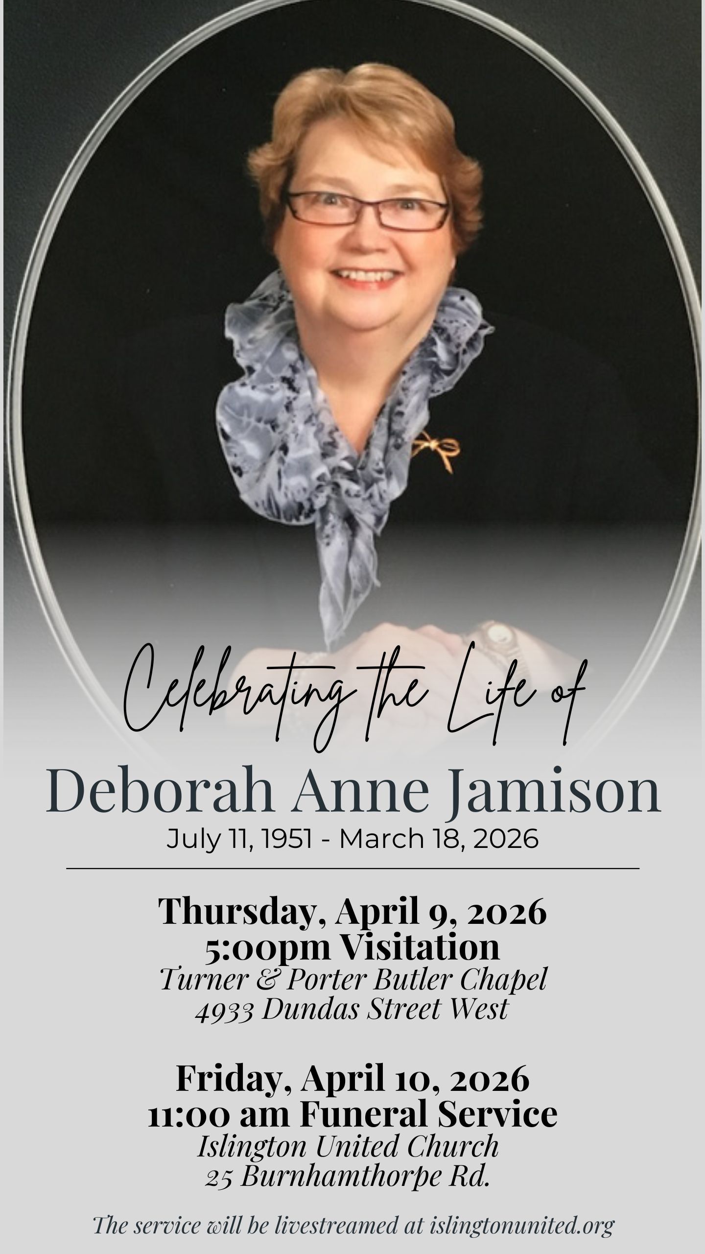 A visitation and funeral will be held on April 8 , 2026 at Islington United Church, 25 Burnhamthorpe Road, Etobicoke. Visitation will begin at 1:30pm followed by the service at 3pm. Service Livestream