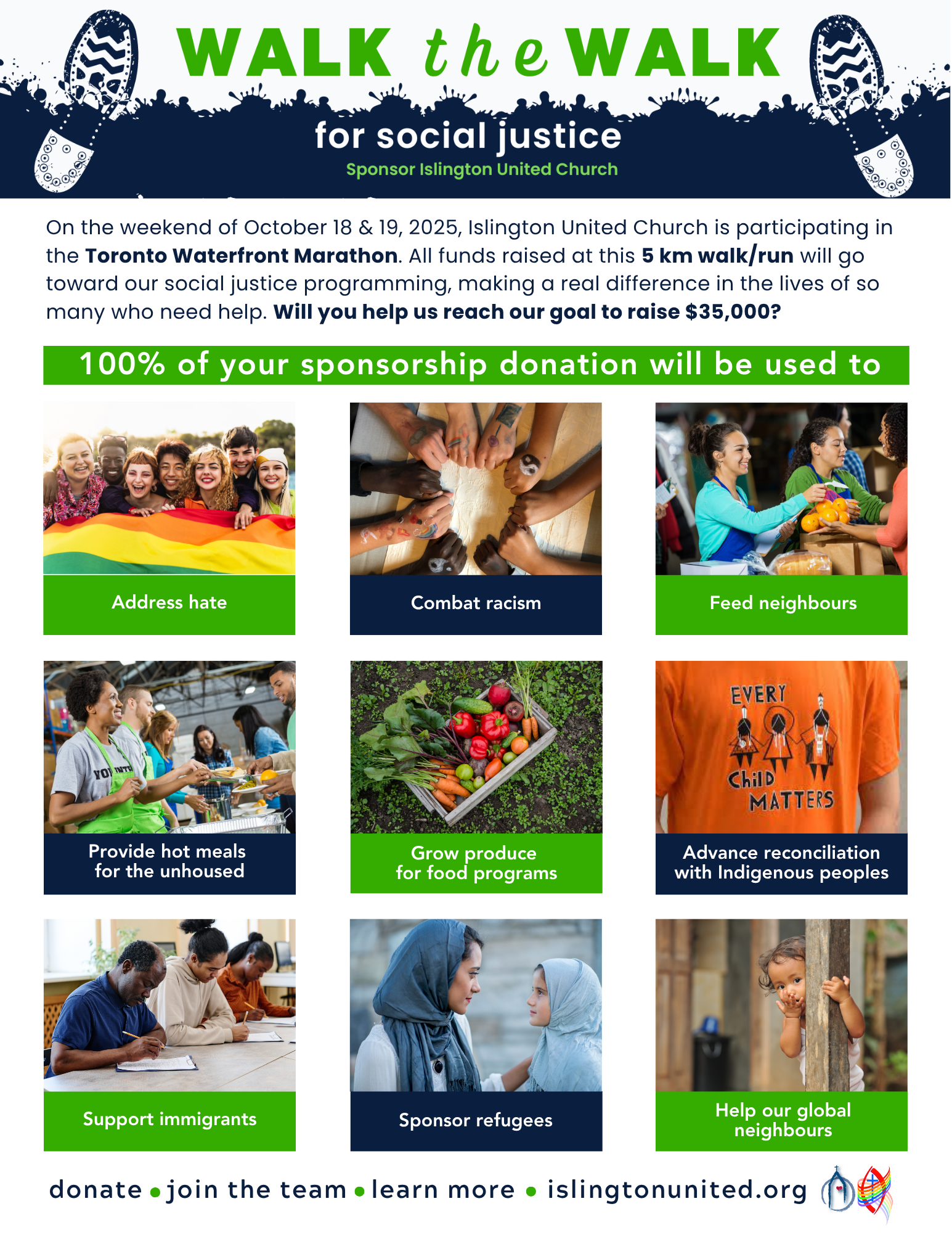 Please join us for a 5 km walk/run as we participate in this year’s Toronto Waterfront Marathon Charity Challenge in October 2025. Islington United Church has participated in the Toronto Waterfront Marathon for 15 consecutive years (!). Captain Dennis Bradley was at the helm of our enthusiastic Running and Walking for Refugees team since the beginning and has continued to lead us as we WALK the WALK for Social Justice. All funds raised will go toward our social justice programming, making a real difference in the lives of so many who need help.